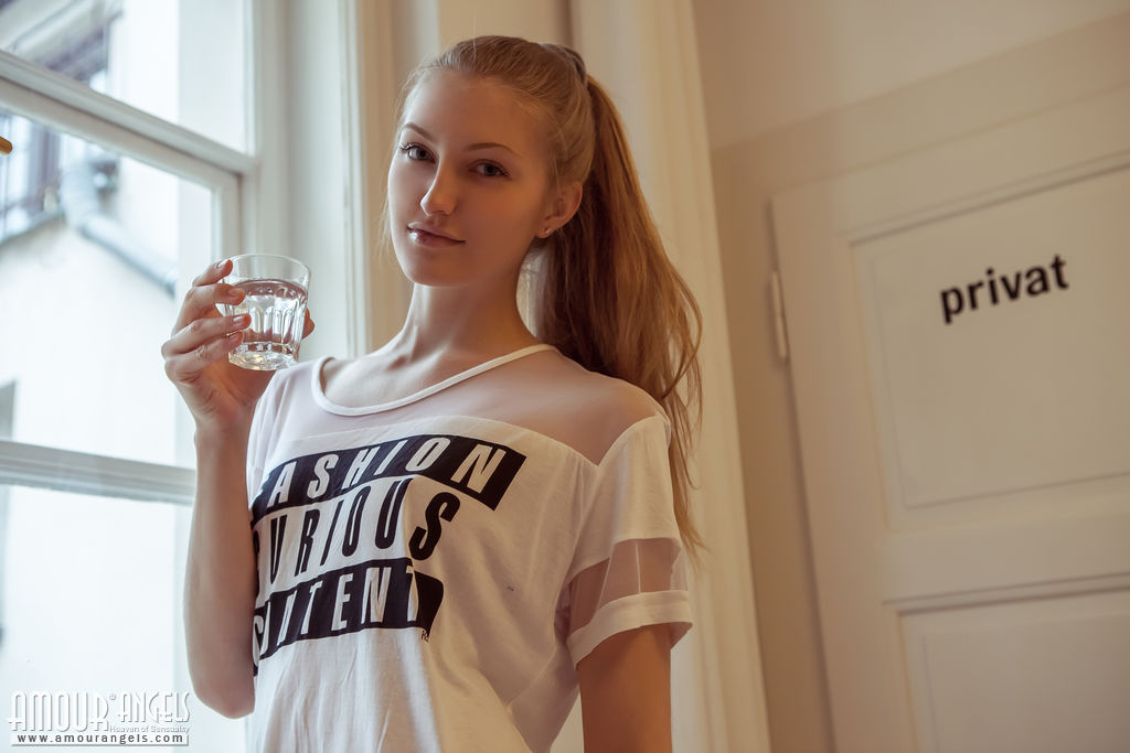 Gorgeous blonde teen chick with sun shades stripping whilst ingesting a scrumptious cocktail.